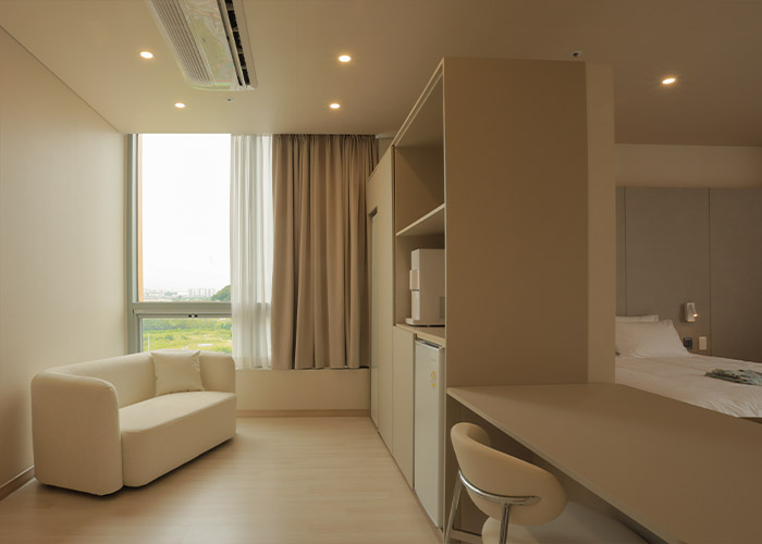 모든 객실은 스위트룸으로 숲과 하천이 보이는 조망입니다.